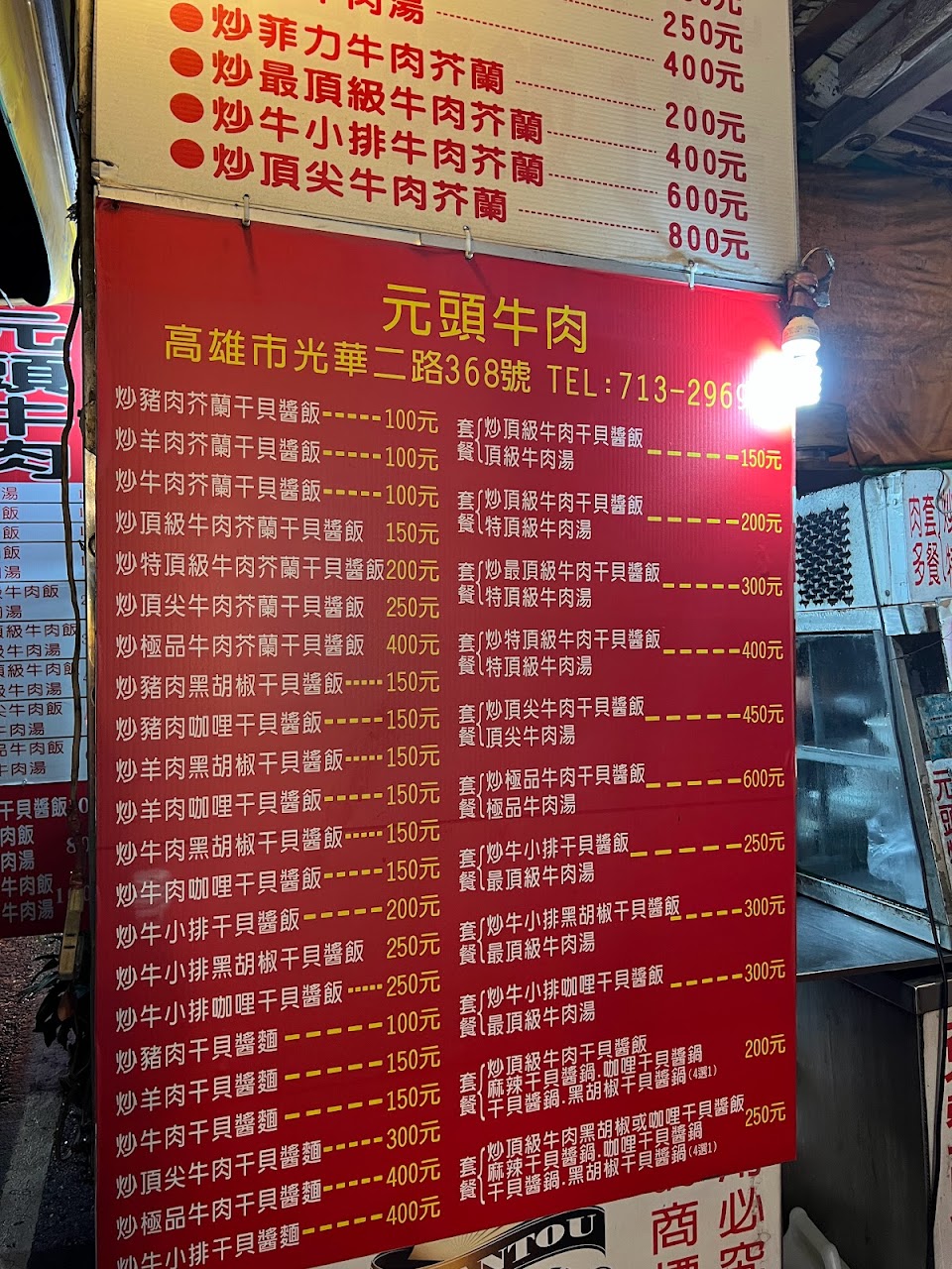 光華夜市很奇妙的一間店 店裡沒有菜單但貼得到處都是菜單 每道菜都有個封號頂級、特級之類的 價位落差也很大但看不到差別 就頂級干貝醬牛肉飯及頂級牛肉湯 干貝醬牛肉飯有點驚訝到 整個很大一碗青菜牛肉飯都滿滿的 但吃不出干貝醬的味道 份量足夠但調味稍嫌簡單 牛肉筋多還算軟嫩 湯裡的肉就很少味道普普 牛肉有點過熟 整體吃起來滿獨特的感受 但應該不太會再嘗試 餐點:3 服務:3 氣氛:3