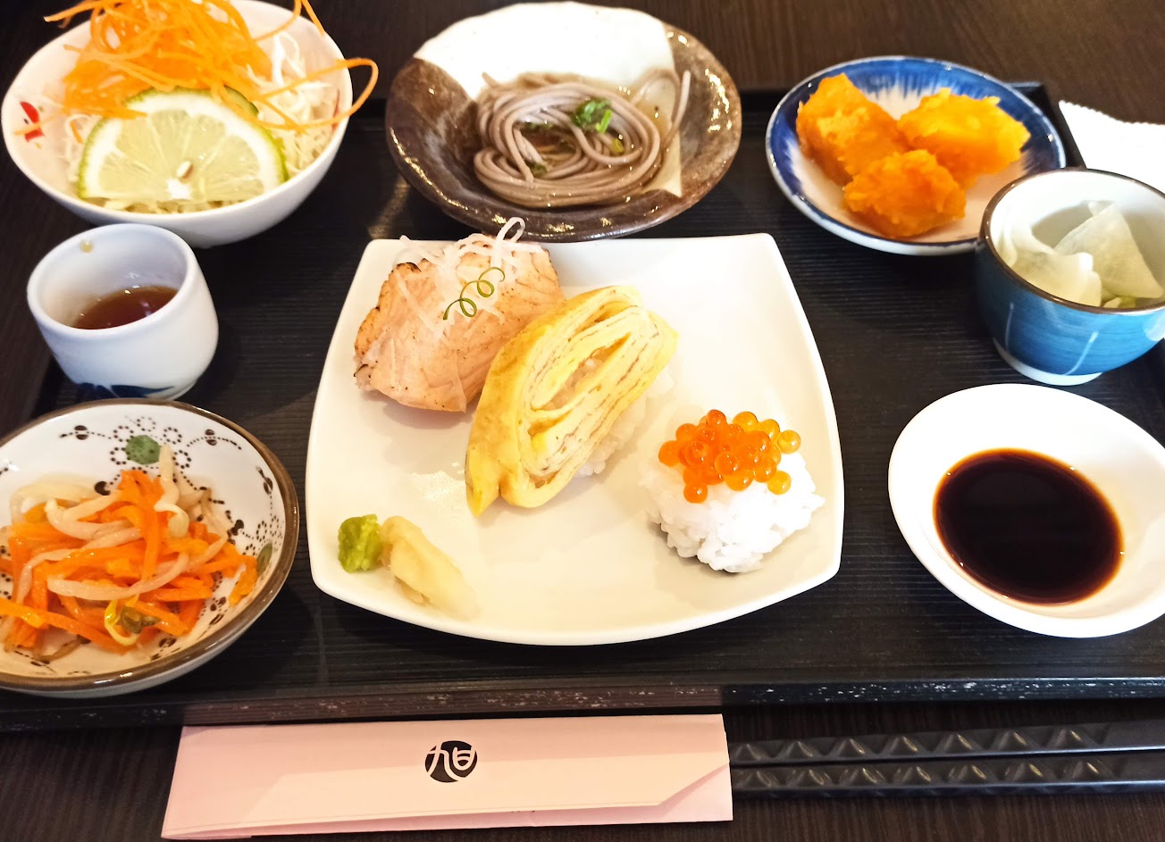 烤雞腿定食。前菜的部分非常豐富,蕎麥麵+小壽司+兩塊甜甜的地瓜,味道恰恰好符合每道小菜應有的特色,很不錯!主食的部分有感覺到廚師很認真去烹調,嫩且不會有過分的調味。味增湯的部分可能就會對部分人來說偏鹹,但很日式。