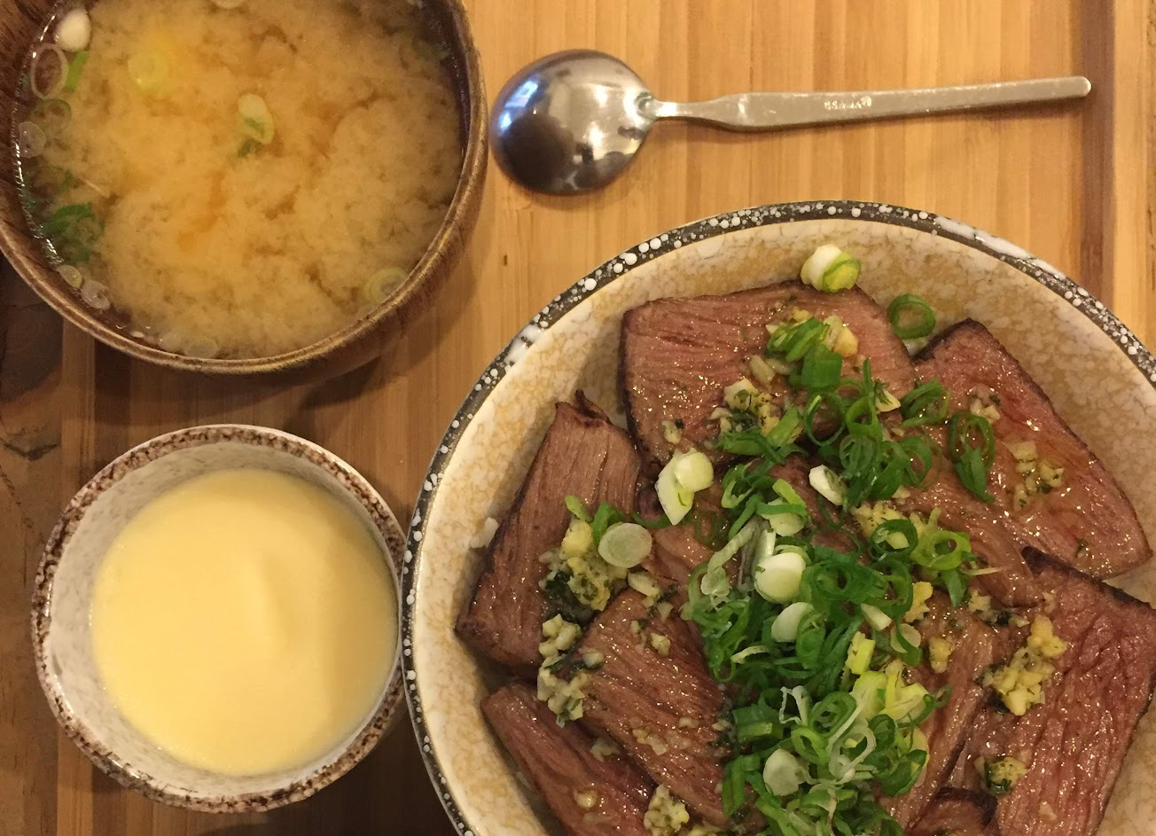 第一次去點了牛排丼,牛肉外表焦焦的裡面嫩度剛好,搭配蔥花和蒜頭做的醬頗下飯。不過份量不多,價格稍貴,不過蠻好吃的可以來試試看。