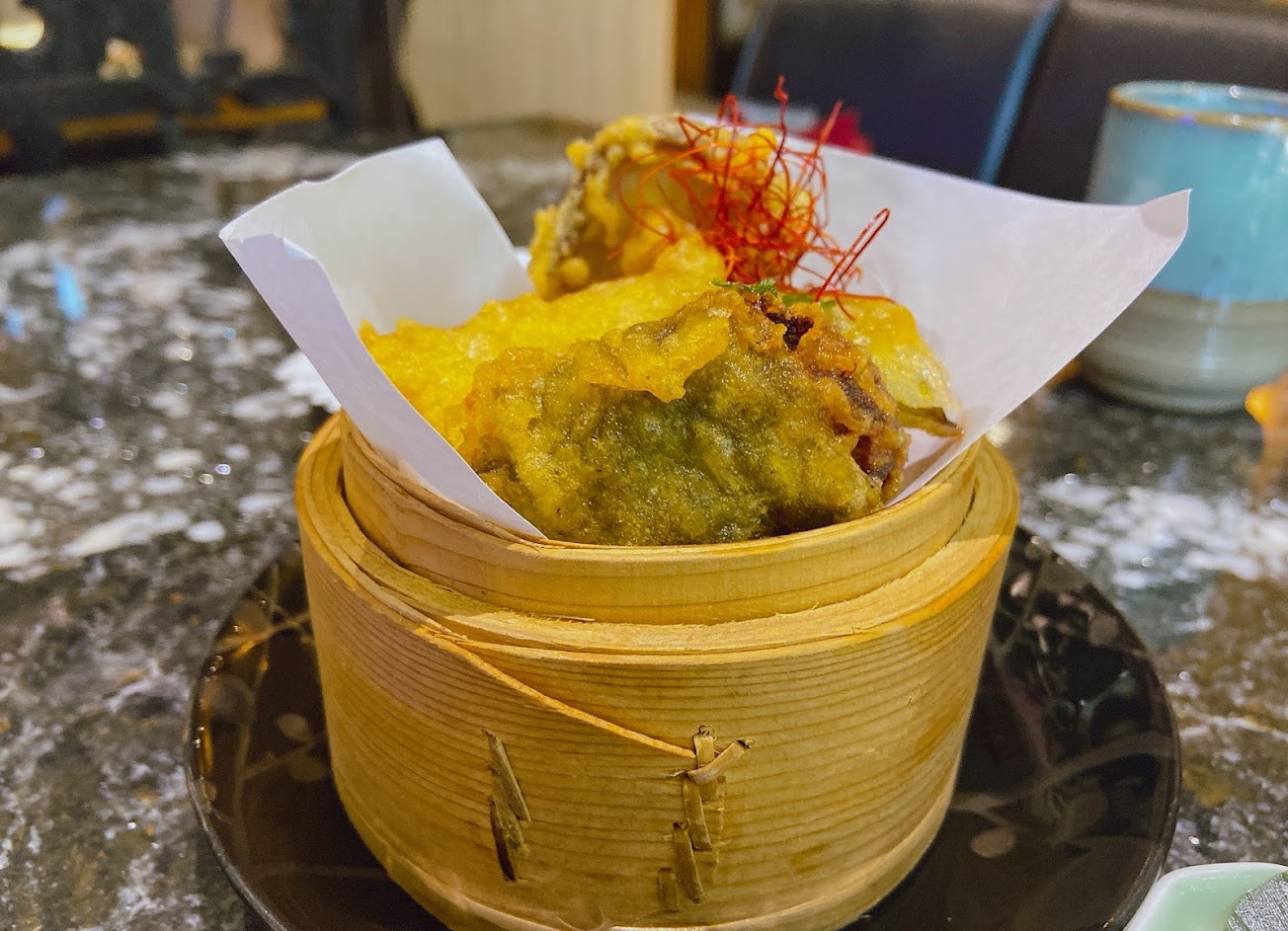 上頭放上干貝與珍珠捲,替炸物緩衝解膩。