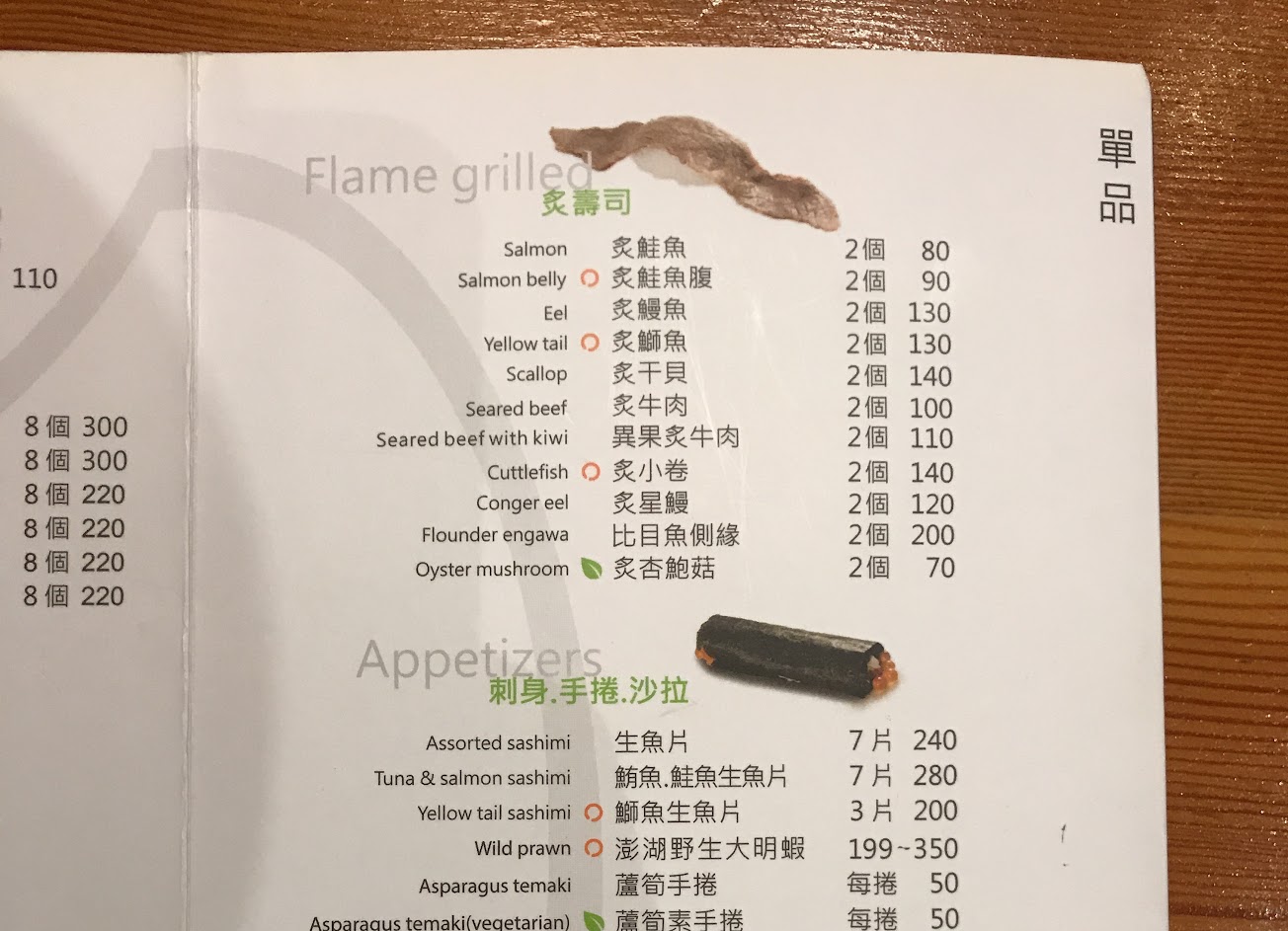 推薦:炙鮭魚腹$90、果香加州卷4個$120/8個$220