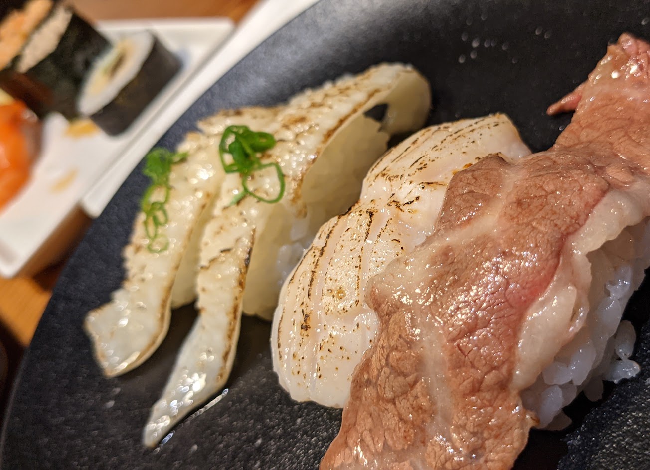 價格平實的壽司,味道尚可,鐵火鮪魚好吃,總匯壽司跟炙鮭魚滿普通的(普偏下的程度),炙干貝好吃一些?