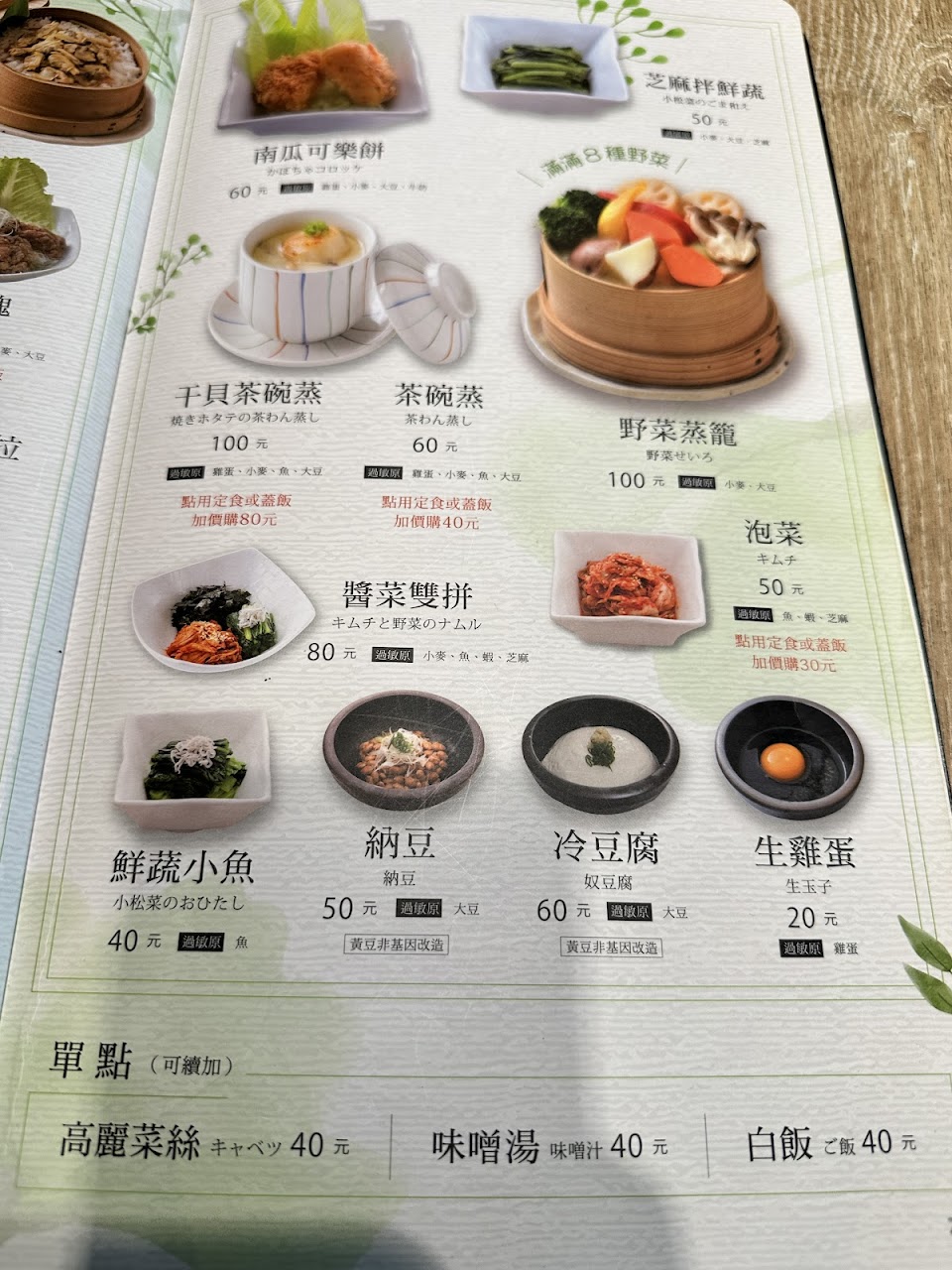 點了雞肉蔬菜燴黑醋醬定食、雞排醬蓋飯+蕎麥湯麵和干貝茶碗蒸 雞肉蔬菜燴黑醋醬的雞肉肉質鮮嫩不過調味蠻重的,偏鹹很下飯,配菜的高麗菜絲配上黑醋醬比較清爽可以中和雞肉的鹹,蔬菜量不少;雞排醬蓋飯的雞排略厚,但是酥脆不油膩淋上醬還是好吃,下面有高麗菜絲,飯對於小食量來說很多;蕎麥湯麵口感很清爽,配上蘿蔔醬和海帶還不錯;乾杯茶碗蒸的干貝大顆不會咬不爛