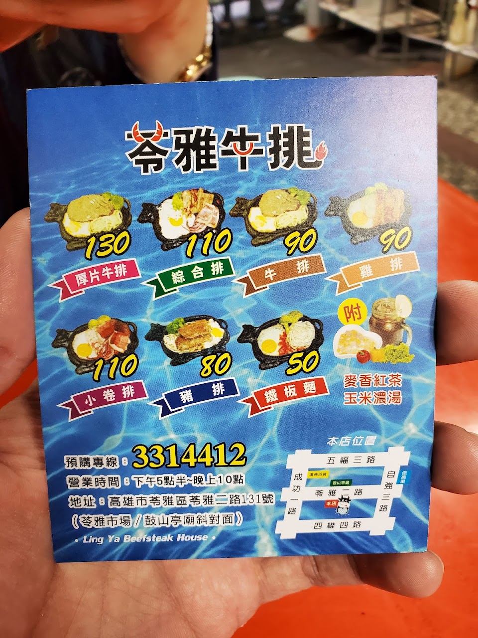 我是相信網友過高的稱讚,才會敗興而歸,純粹當作一般流動夜市的心情,就會覺得是不錯的收穫。可能多久喜歡他們肉多一點點吧,豬肉是不錯吃,其他份量不多也沒有肉好吃,排餐的醬料味特殊也淡,紅茶不冰也沒加什麼甜,當作一時解渴還過得去;這個餐盤的牛臉毀容性目前看過他們算是第一,應該用很久了,沒有餐包所以當作週期性夜市就不會落差太大, 餐一來馬上要收錢,但是對一般排餐來說,都要先處理蛋,怕鐵盤不夠熱,蛋會來不及翻,結果傻眼的是蛋老早就煎熟又偏焦,放進來鐵盤好看而已,我只是問一下,老闆娘就不耐煩的說這樣比較快啊,不然還要等…..心都冷掉一半了,忘了說那個玉米濃湯,真的與眾不同的喝了懷疑人生,不知道是蒜頭還是什麼提味,讓整個湯喝了很困惑,真的一次性經驗,謝謝。這個夜市三家,一家臉超臭不可能進去,另一間普通,態度也沒比較好,但主動放棄這個地方的牛排店了。