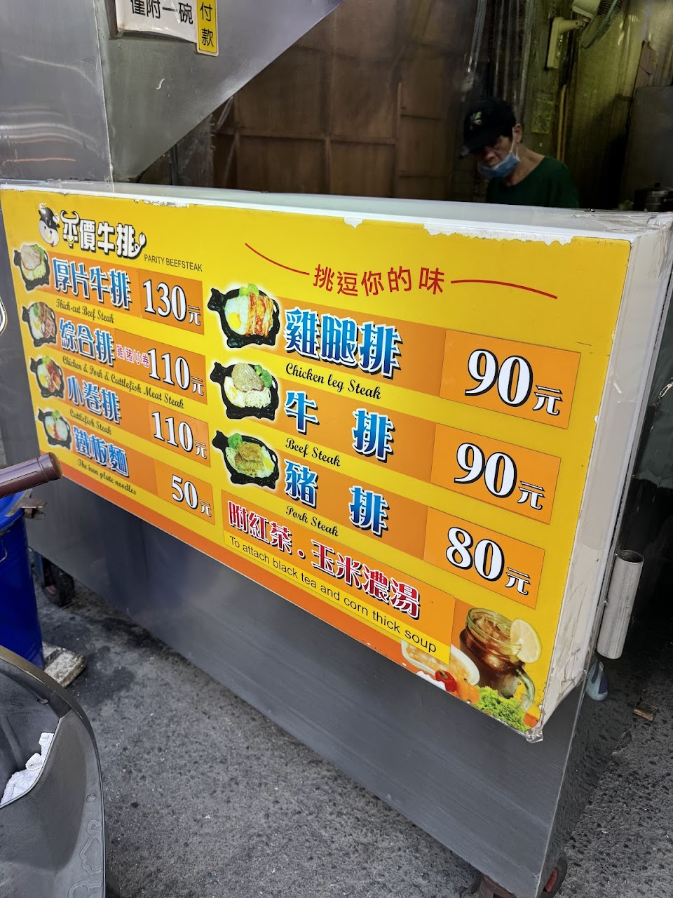 我是相信網友過高的稱讚,才會敗興而歸,純粹當作一般流動夜市的心情,就會覺得是不錯的收穫。可能多久喜歡他們肉多一點點吧,豬肉是不錯吃,其他份量不多也沒有肉好吃,排餐的醬料味特殊也淡,紅茶不冰也沒加什麼甜,當作一時解渴還過得去;這個餐盤的牛臉毀容性目前看過他們算是第一,應該用很久了,沒有餐包所以當作週期性夜市就不會落差太大, 餐一來馬上要收錢,但是對一般排餐來說,都要先處理蛋,怕鐵盤不夠熱,蛋會來不及翻,結果傻眼的是蛋老早就煎熟又偏焦,放進來鐵盤好看而已,我只是問一下,老闆娘就不耐煩的說這樣比較快啊,不然還要等…..心都冷掉一半了,忘了說那個玉米濃湯,真的與眾不同的喝了懷疑人生,不知道是蒜頭還是什麼提味,讓整個湯喝了很困惑,真的一次性經驗,謝謝。這個夜市三家,一家臉超臭不可能進去,另一間普通,態度也沒比較好,但主動放棄這個地方的牛排店了。
