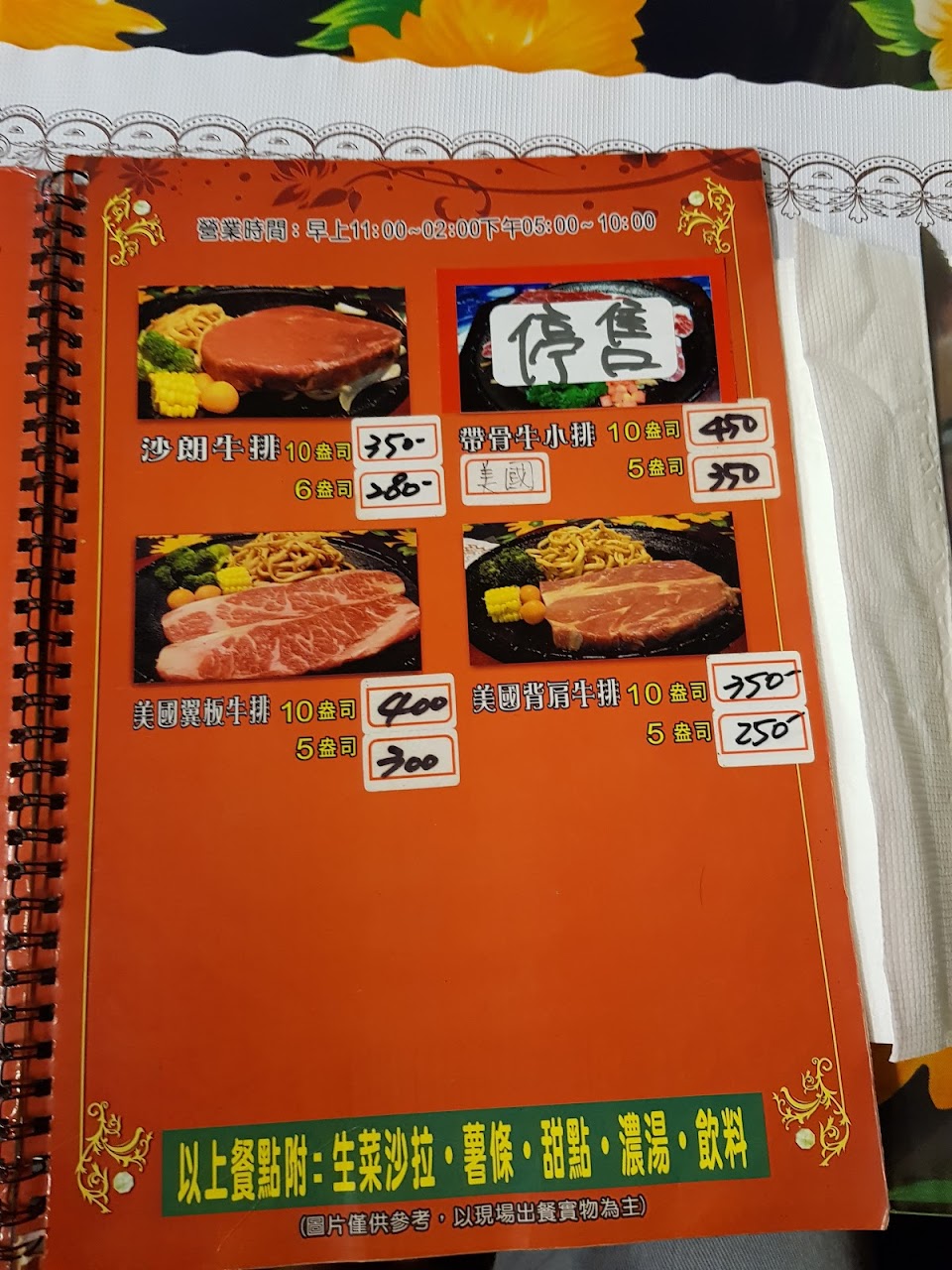 蠻有趣的店,很像是西餐廳,比較有年代的西餐廳。環境比較老舊也比較昏暗,走台階要小心喔。 整體價格都稍高,但份量也會有很大的感覺,至少蔬菜不少。肉還蠻好吃的,沒有用嫩精,稍硬但不會很硬。醬汁略油但好吃,上桌時是分開來的喔。沒有蛋喔,要額外付費。 玉米濃湯和飲料自取,也有不少醬料和麵包塊。