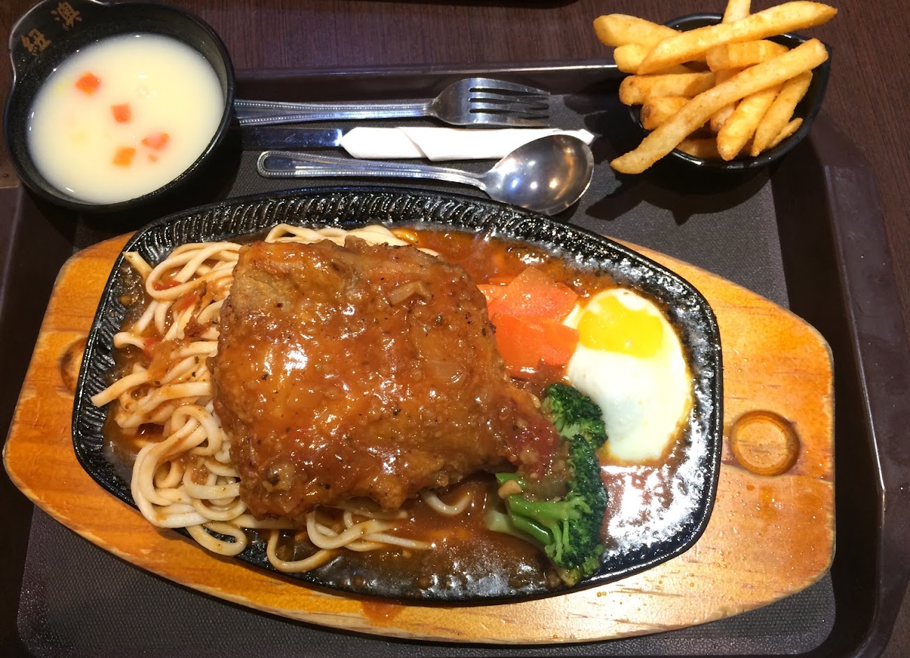 夜市都比較好吃,薯條冷掉感覺放很久,湯味道有點怪,牛排很柴,很少吃那麼貴的鐵板牛排但又那麼難吃