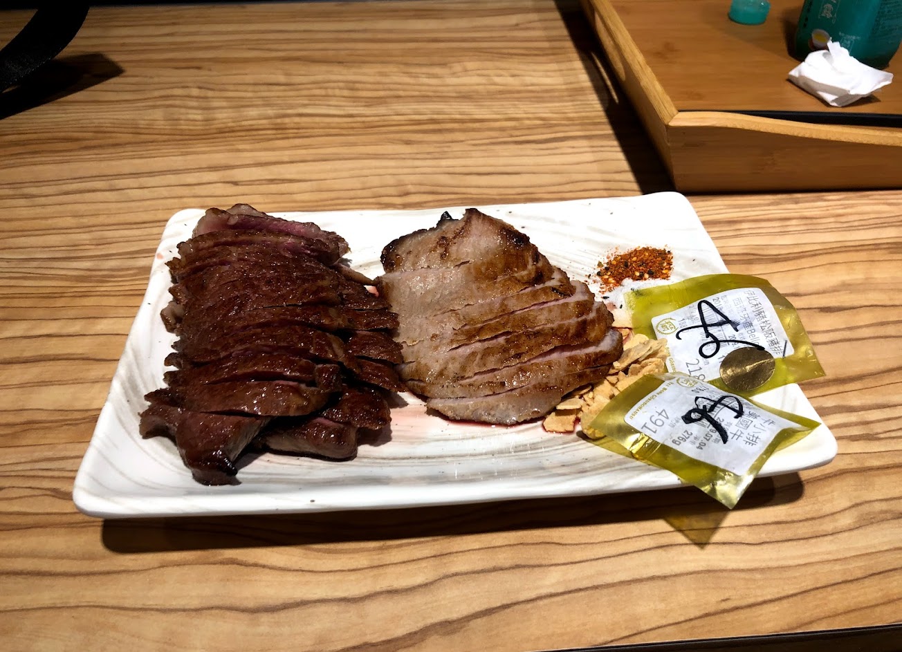 一樓的大姐很熱心幫我們介紹,二樓有代煎服務,推薦厚牛舌、伊比利豬、牛肉餅都好吃