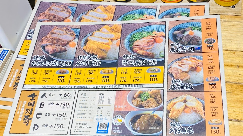 份量足夠,豬排厚度很令人滿足,咖哩醬也給的很大方,可淋滿每一粒米及豬排,另外還附種類豐富的蔬菜盒,cp值相當高的一間店,服務也很好,非常推薦。 服務 外帶 餐點類型 午餐 平均每人消費金額 $1-200 餐點:5 服務:5 氣氛:5 建議的餐點 鋒勝打狗町炸豬排咖哩飯