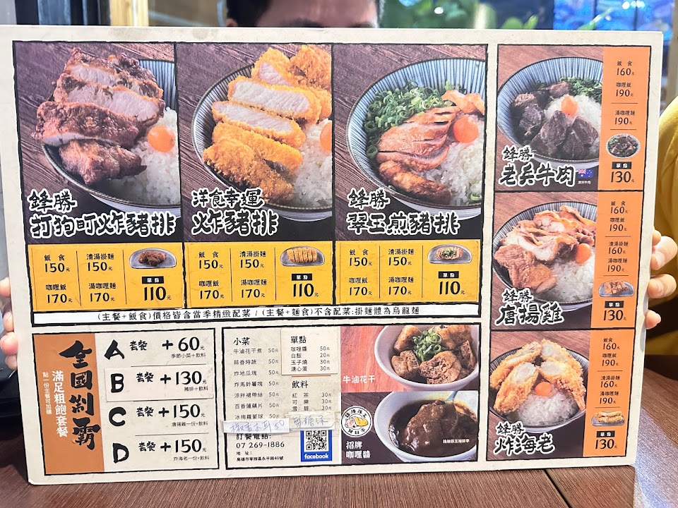 鋒勝豬排是偏台式排骨口味,但是是加厚版,口感很好! 唐揚雞肉很嫩多汁,好吃! 一口菲力也是一樣厚實又鮮嫩多汁,也推! 自取的洋蔥豬肉湯也是很用心很好喝耶,洋蔥味道相當濃郁,裡面的豬肉塊也又大又嫩,讚!花干是牛肉湯口味的,相當入味,好吃! 然後點了咖哩醬其實滿多的,但稍微偏稀,然後有點鹹,如果想吃咖哩,建議兩人以上點一份咖哩即可。 沒有洗手間,沒有洗手間,稍微有點不方便,要提醒大家一下 服務 內用 餐點類型 午餐 平均每人消費金額 $200-400 餐點:5 服務:4 氣氛:4