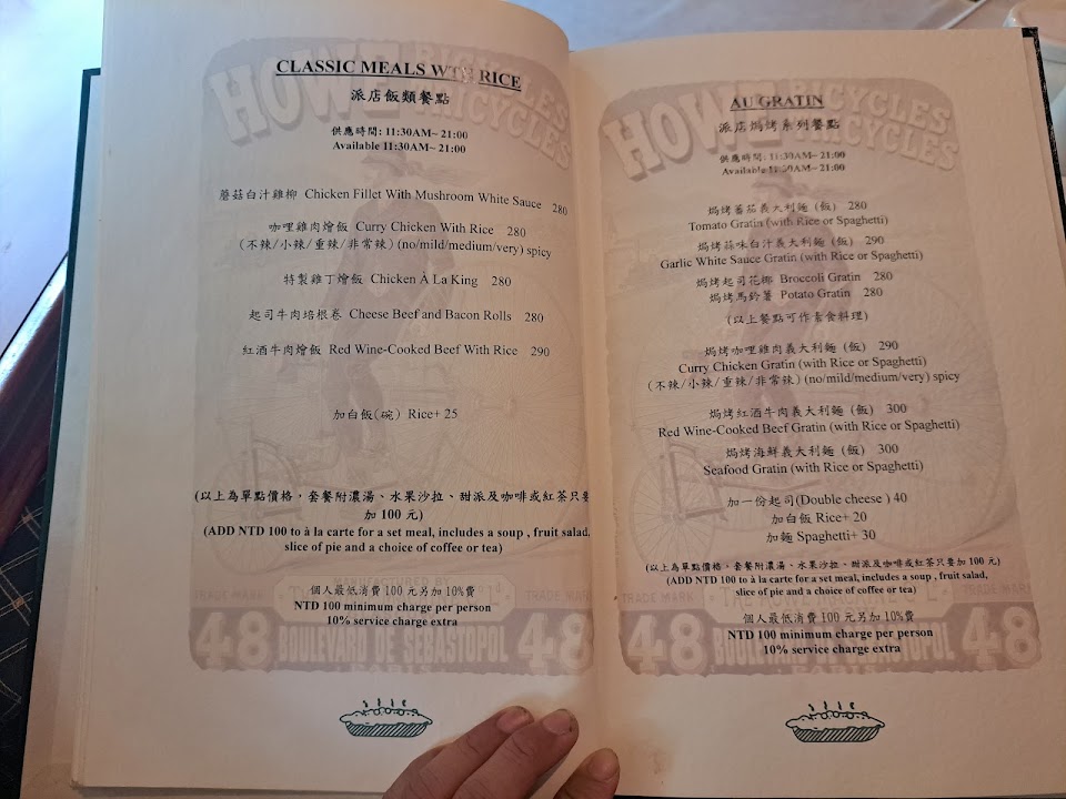 電視上外國常見的派料理在臺灣算是少見 品項特殊有市場區隔 可惜其味我已經吃過三種主餐派一種義大利麵給過不少機會仍然 感覺勉強也只能算是中等 有些中下 且吃的時候最後常常都會弄的爛爛的(可能是我的問題?),而且一層面皮包裹一些餡料的所謂派的呈現方式很多都任我覺得不搭,並且份量上不大 整個升級+100元的套餐吃下來 感覺至多5分飽 派的份量並不多 食量偏大的人可能要搭配別的東西才能吃飽,稍微有點失望 。