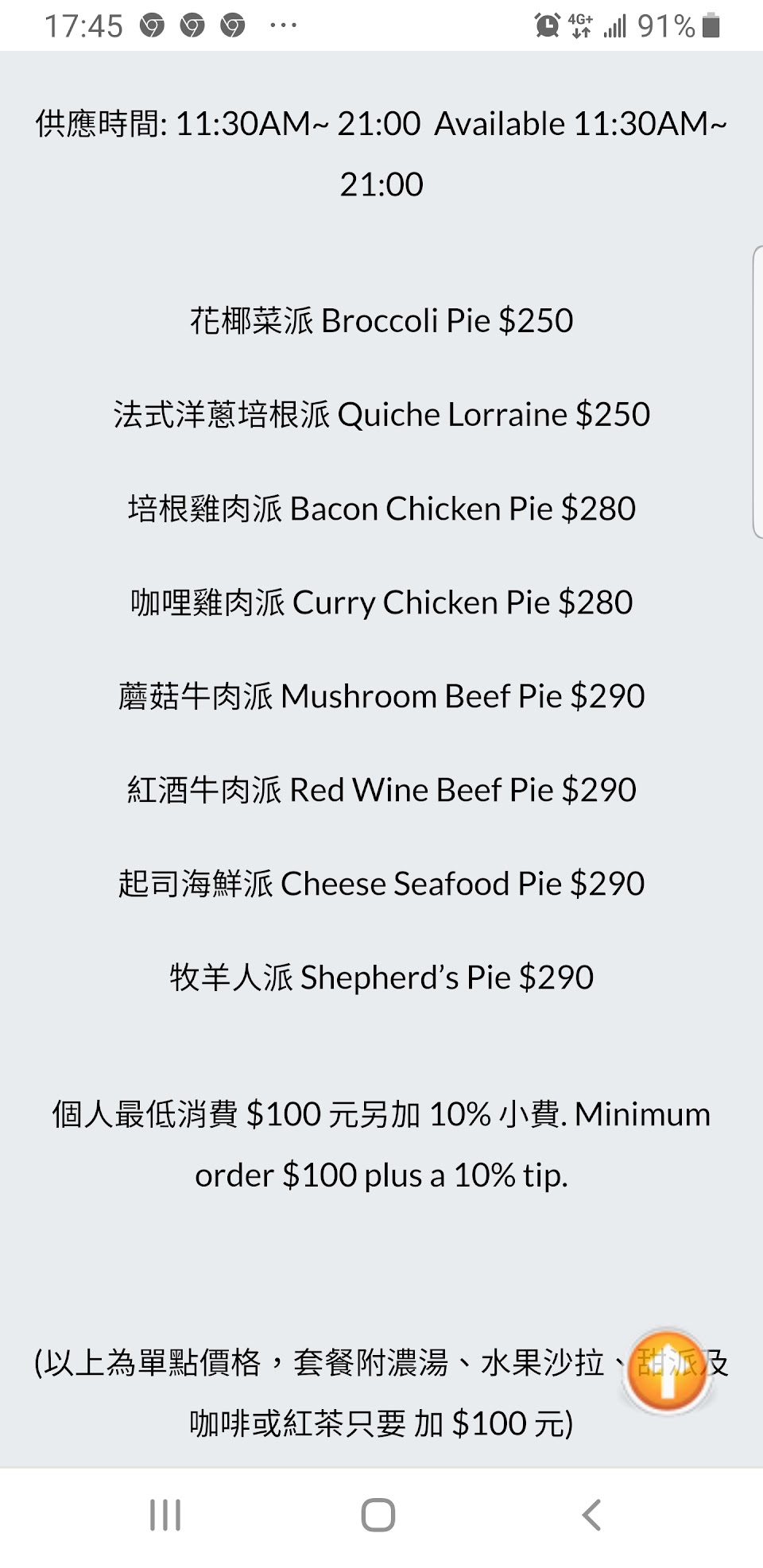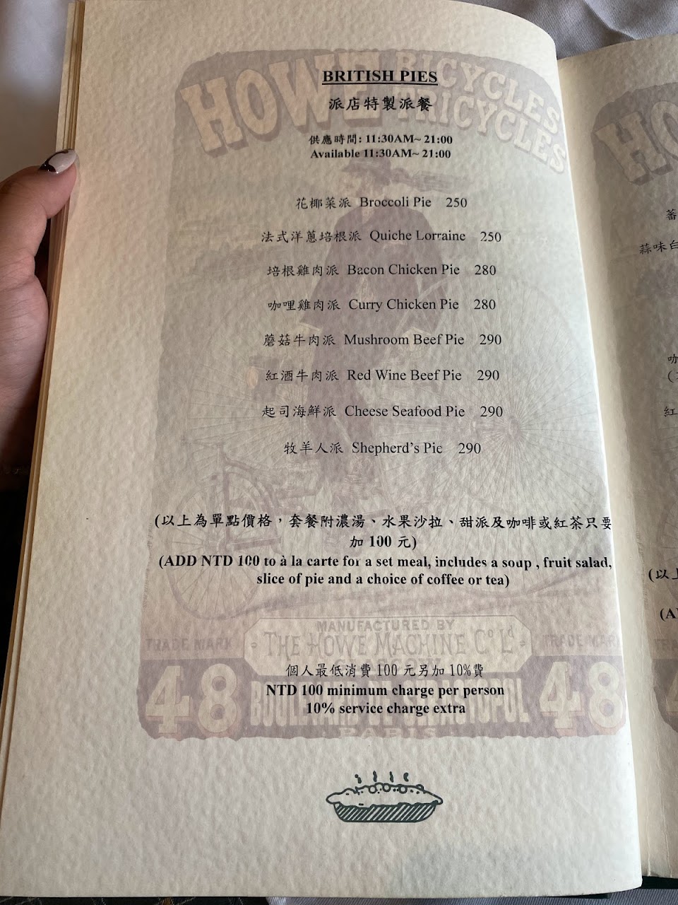 用餐環境很好很有氣氛也是超級道地的英式派店 鹹派真的很推薦大家吃看看 而且加$100就能升級套餐(有濃湯、甜派、飲料、水果) 不過覺得甜派的部分沒有那麼喜歡 口感跟想像中有點不同 不過還是推薦大家來吃看看 也有下午茶的優惠set!