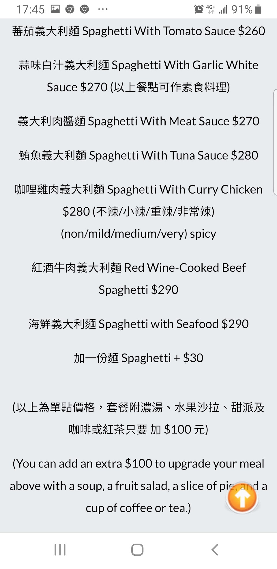 ※所有餐點+$100都可以升級套餐=水果沙拉+濃湯+飲料+蛋糕