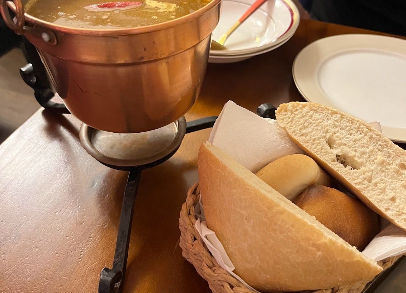 斯拉沃尼亞牧羊人燉肉,看湯的顏色還以為是咖哩,實際喝一口就知道是非常濃的肉湯,還有明顯的胡椒味。這湯裡含的馬鈴薯麵疙瘩口感絕佳,放在一旁的麵包更是讓我驚艷,已經到達我對西式麵包口感標準的天花板了,未來在歐洲五星級餐廳吃到的大概也與此相差不多吧?