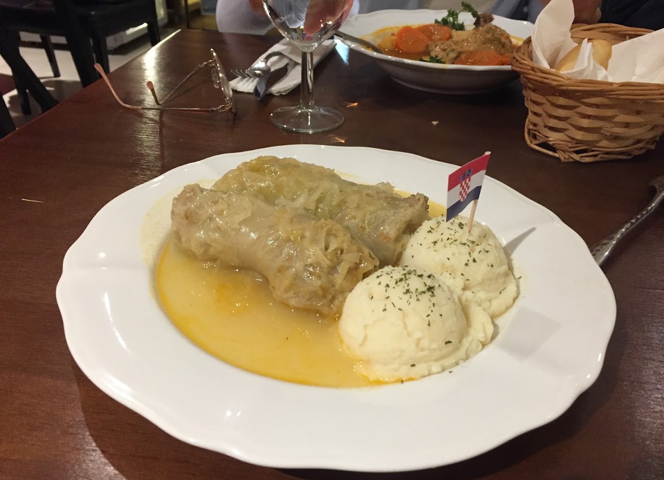 很有特色的小館子 點了據說是當地聖誕節特色菜的高麗菜肉捲佐酸菜 搭酸酸的醬汁吃起來蠻過癮也不容易膩 口感溫和綿密的馬鈴薯泥平衡了酸味,讓滋味更多元完整 看圖片以為份量不大,全部吃完就飽到不行 希望下次留點肚子品嚐甜點~ 另外點的甜椒燉雞腿和牧羊人燉肉滋味都不錯~
