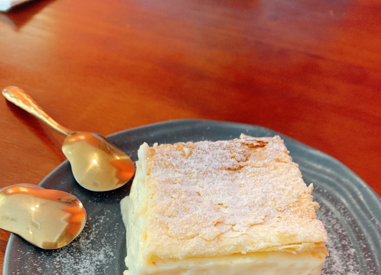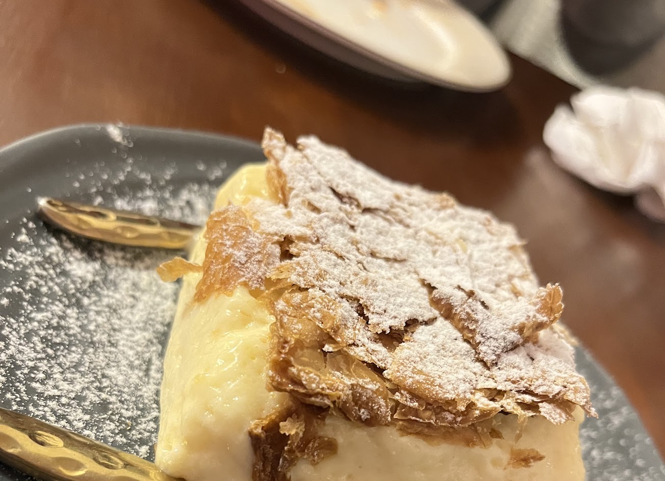 閱甜點無數的我是第一次吃克里皮塔,口感上有點像布丁到奶酪間的口感,味道上比奶酪更濃郁,上層一塊酥皮(?)讓本身軟綿的口感增加了層次感,整體來說很好吃!