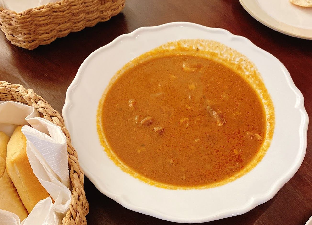 「紅椒燉雞」口感溫和,雞肉燉煮得十分軟爛,非常適合在冷冷的天氣享用,隨餐附上的麵包很香,沒有多餘調味,很適合沾湯或蘑菇醬