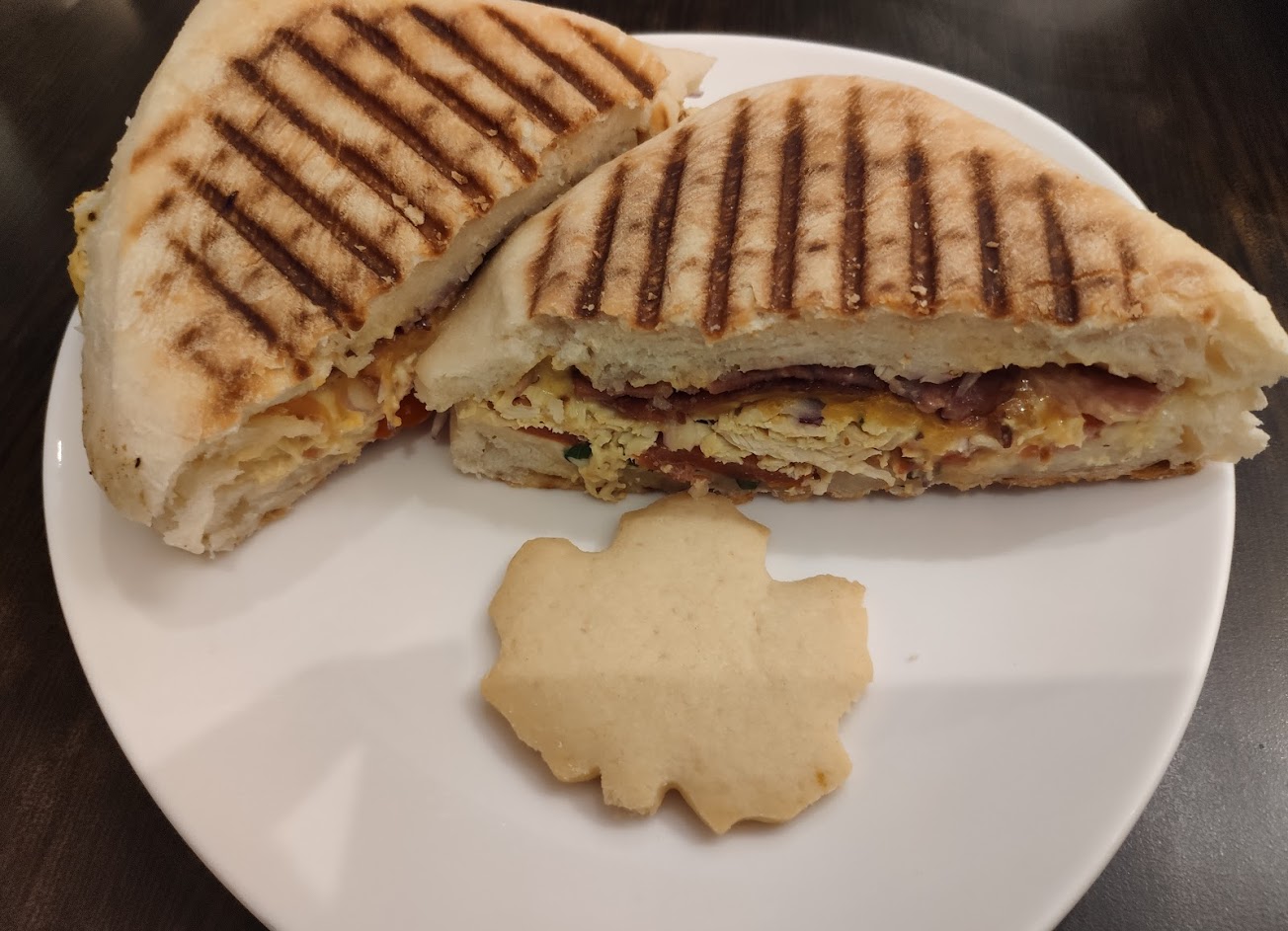 經過很多次但第一次造訪,點了沙拉、帕尼尼、雞翅、農夫茶。 沙拉很新鮮,蔬菜搭配很好,不會很像一些餐廳沙拉很單調。帕里尼麵包較硬,餡料飽滿好吃,肉有一點少,洋蔥夠味。雞翅非常好吃,尤其搭配楓糖辣醬味道更提升??最後是餐廳主推的加拿大進口茶,茶葉很香,像水果糖,但喝下去甜味就不見了,反而是水果的酸莓果味跟花香,不加糖就很好喝,適合搭配口味較重的東西來去膩。