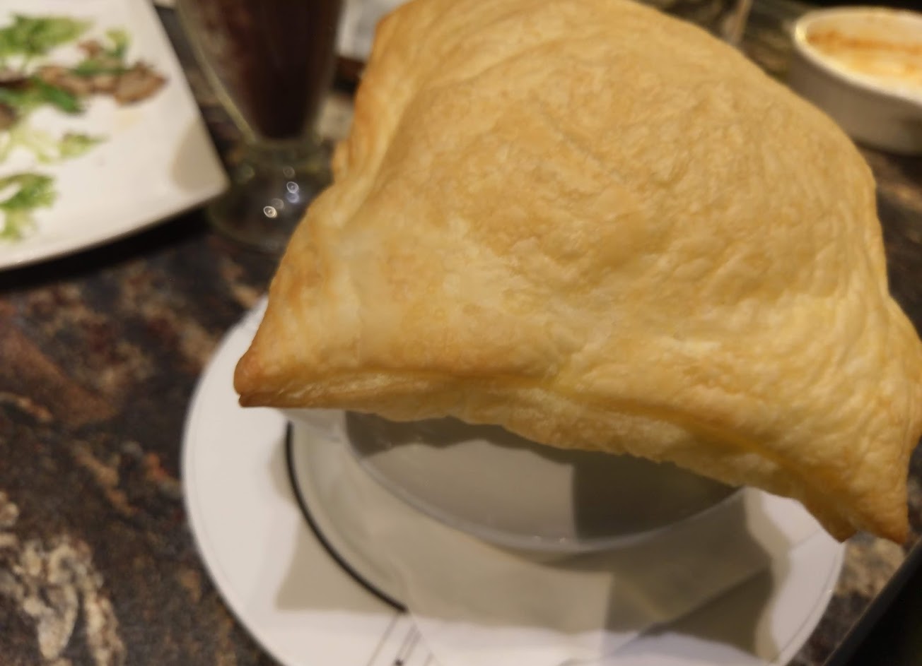 經典料理-起司鮭魚盅搭配類似可頌的麵包很好吃,沙沙冰不會太甜,濃度適中,香菇蔬菜湯湯料簡單,湯頭清淡不差,主餐的焗飯,飯的味道與焗烤和醬料沒有融合在一起,相對前菜而言略微普通遜色