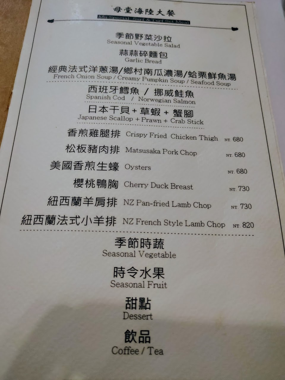 IG:eric_hu.26 一間溫馨的小店 位置數量不多 每個時段最多10位客人 請提早預約 有些比較特殊的主食 也需要提前預訂才吃得到喔 今天點了 紐西蘭法式小羊排 以及 美國Prime老饕肋眼眉 第一道 沙拉 很喜歡他們調製的沙拉醬 酸甜剛好 第二道 湯品 南瓜濃湯 非常濃郁 有點像國外的濃湯利樂包 鮮魚湯 湯頭很清淡 喝的到蛤蜊的鮮甜 第三道 鮭魚與蟹肉棒 第一次吃到香煎蟹肉棒 煎得恰到好處 整個香氣從口中噴出來 第四道 干貝與大蝦 大蝦非常結實,不軟爛 想當然應該很新鮮 第五道 主食 小羊排入口即化非常嫩 可惜沒有羊騷味 肋眼眉牛排 點五分熟的沒有過多的血水,鮮嫩多汁 可惜主食的量少了點 第六道 蛋炒飯 香氣十足 粒粒分明 吃完以上料理 移動位置到二樓吃甜點 飲料部分比較普通 現煎的銅鑼燒有芋頭與紅豆口味,不會死甜,沒有太多負擔 水果表現也是比較普通