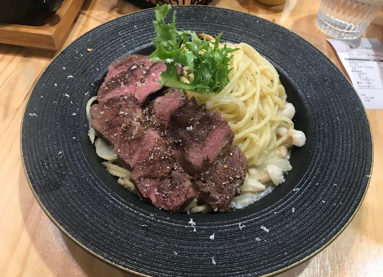 奶香阪腱牛義大利麵,奶香醬汁不算很濃郁,適合吃久怕膩口的人,但我個人偏愛濃郁一點的白醬~阪腱牛的部分!超嫩超好吃,肉香四溢,感覺搭配紅醬茄汁的話會更對味?