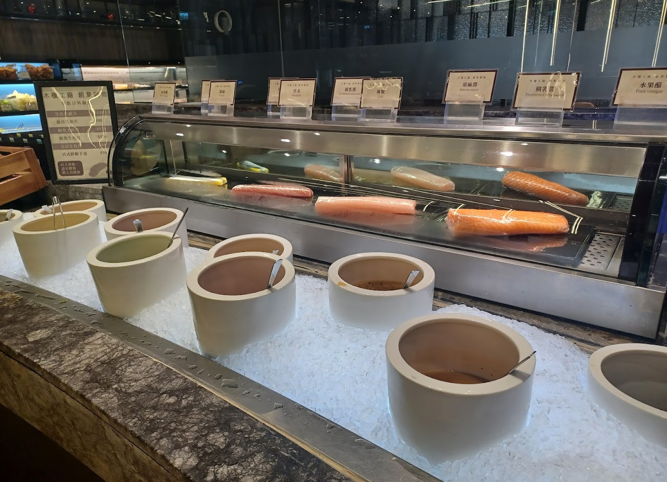 在飯店裡的木櫃用餐真的是一大享受,自助吧很多選擇,食材新鮮,蛤仔跟蝦不怕人點,給的快又多,店員服務優,還有機器人來回穿梭送餐,牛奶鍋濃郁,奶油烤布蕾超推??