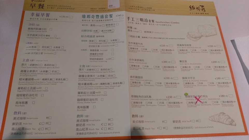 牛肉三明治好吃,但更意外的是附餐的美式咖啡!平常都是喝手沖精品咖啡的我,對早餐店的咖啡都不抱期待,但是維那奇的美式咖啡出乎意料的好喝! 服務 內用 餐點類型 早午餐