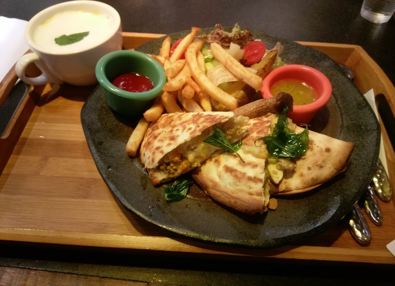 因為很喜歡多一點的麵包所以點了附麵包的餐點,沒想到餐點一上就發現跟很久以前吃過一次時點到的一樣XD(不喜歡麵包的人可以選附薯條的組合~)三杯雞真的很好吃,香噴噴的,雞肉很多塊,吃起來很嫩沾滿了三杯醬真的超想跟店員喊「來一碗白飯!」有些部分是帶皮的,我很愛這種軟Q感~麵包要趁熱抹鹹奶油,真的是人間美味~他們的湯很特別~是卡布奇諾濃湯,上面有一層超綿密的奶泡,再擺上一片玫瑰花瓣或葉子做裝飾,第一次看到還真有點看不懂XD喝下去的瞬間也被驚艷到了,溫熱的濃湯搭配鹹鹹的奶泡還真是特別~另一盤咖哩,洋蔥應該是屬於蔬菜裡面的部分,但意外的發現戳洋蔥起來裹一層咖哩醬吃超好吃~軟綿綿的加上洋蔥原本的甜味~