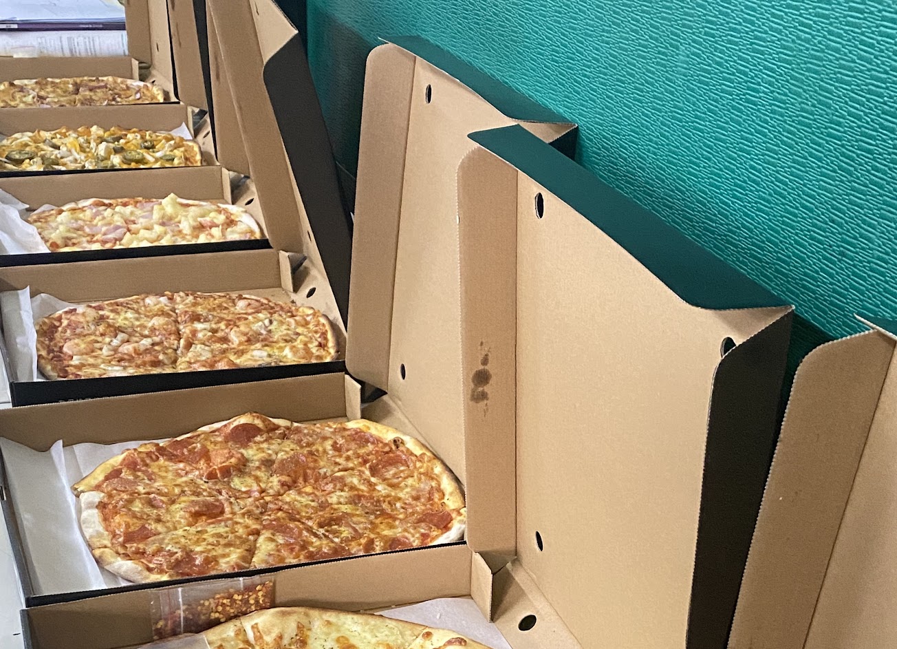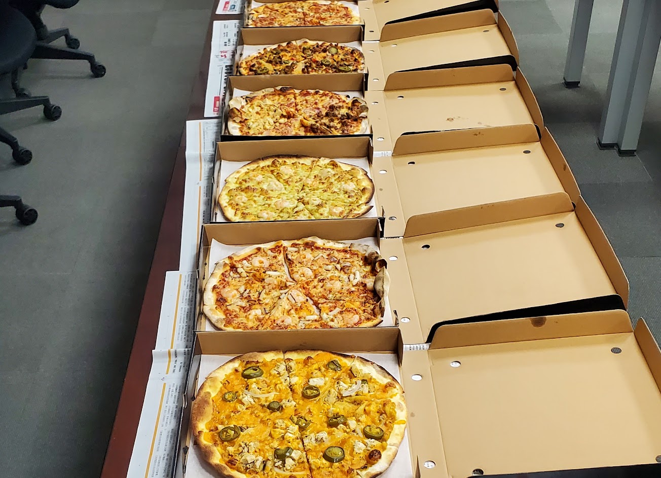點餐期間,因為點的口味比較多,而且又指定特定時間一定要送達,在和店員溝通時,服務態度都很好,沒有一絲不耐煩,我們總共點了18種口味的大披薩,果然大獲同事好評(事先同事就一直很推薦了),短短時間一掃而空啊!辛苦店長下雨天還特地開車幫忙外送到我們公司,感謝感謝。