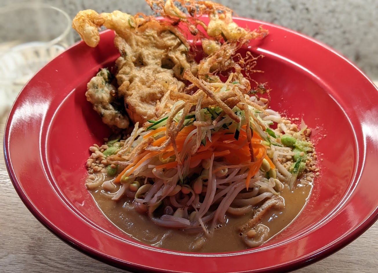乾麵部分,利用麵條的嚼勁、黃瓜的清脆、炸蛋的酥脆,讓口感充滿層次感