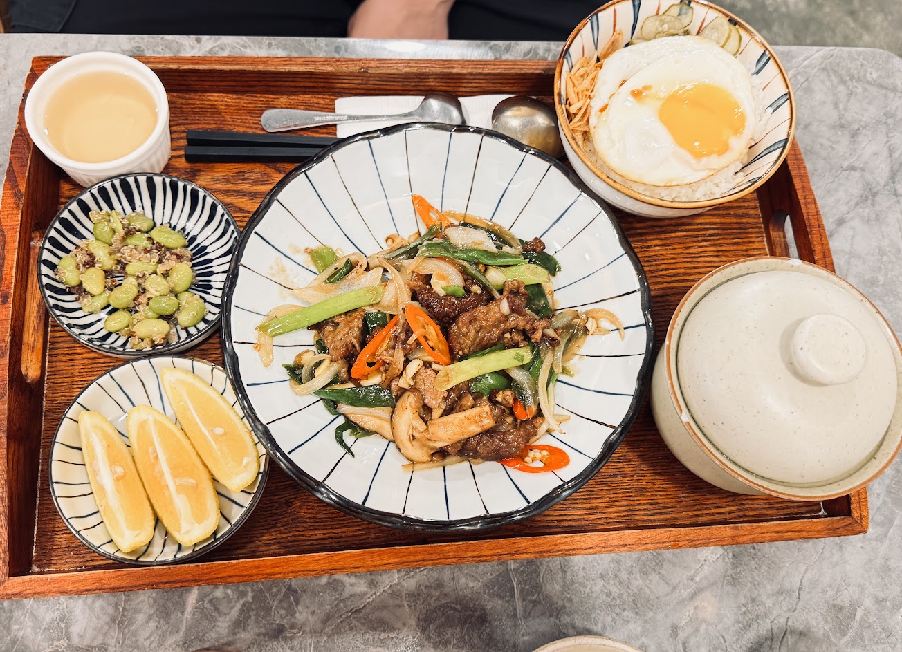 點了三杯雞跟蔥爆牛 每樣食物味道都差強人意 有點過鹹 附的湯是排骨湯 老實說 自己家裡煮的都還比較夠味 環境跟服務都好 但餐點偏貴 爆香的菜(洋蔥/蔥)都比主要的肉還多 餐點:2 服務:5 氣氛:5
