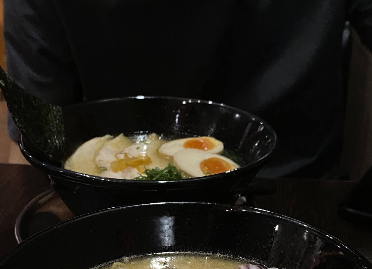 The ramen soup is rich and the noodles are delicate.