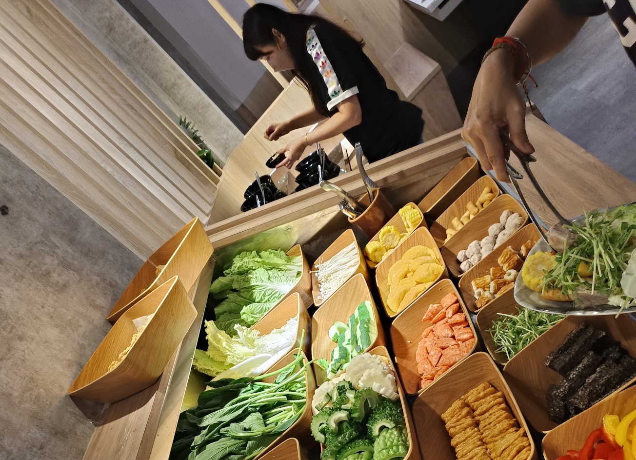 服務人員明明在醬料前整理碗、筷,看了一眼醬料區(當時蔥沒了)然後就離開沒補,之後又晃來看自助區(凍豆腐沒了)ㄧ樣晃著離開,之後來了二組客人才補上自助區的東西,蔥一樣沒補,直到新來客人反應2次才補上~唉!不會想再來⋯⋯冰沙從頭到尾都掛著製冰中⋯⋯⋯無人巡