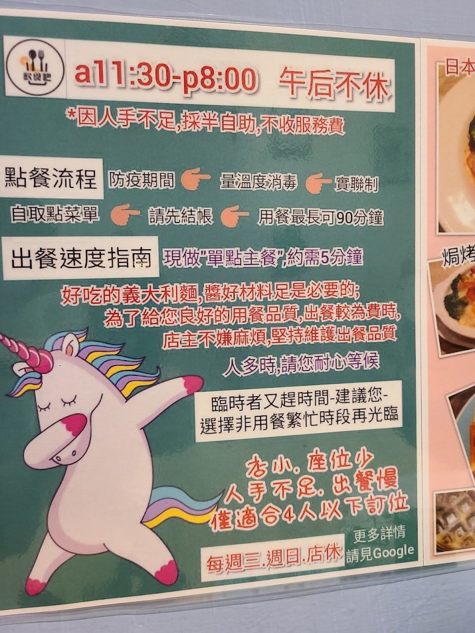溫馨小店,義大利麵好吃,平日中午或假日建議預約,一人作業,急性子或趕時間者不建議來