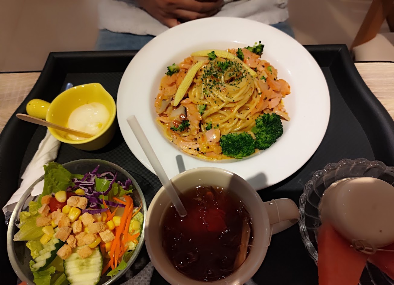 看完電影出來找義大利麵吃,網路查到這間評價4.8顆星,店裡好像只有老闆娘一個人, 算平價,套餐加60元(飲料、沙拉、甜點),義大利麵價位在100初,麵的份量看起來不多,口味還可以,但麵有點乾,莓果茶我覺得有比較甜
