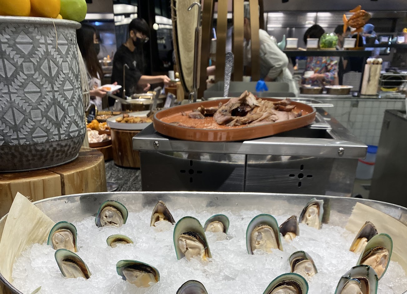 現煮牛肉湯,蠻好喝的。現切爐烤牛排有嫩,肉質不錯。烤鴨捲餅覺得很普通,沒有特色。現煎干貝鮮甜,現煎大蝦肉質粉粉。炸物區的烤蝦比較好吃。