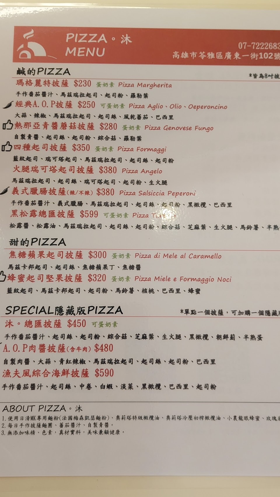 用最好的食材 最好的油 吃出天然、健康、美味 高雄必吃的披薩 服務 內用 平均每人消費金額 $200-400 餐點:5 服務:5 氣氛:5