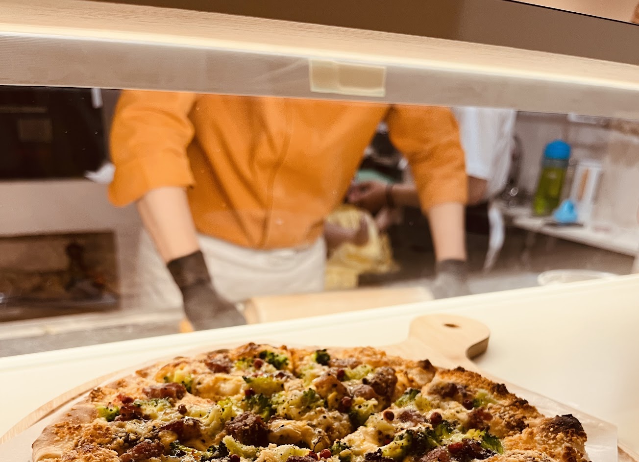 現點現做 pizza的餅皮很薄很薄很薄 真的很薄(師傅手藝真好) 酥脆的口感現在在家裡想起來還會回味 不同口味的披薩帶來的體驗各不相同 舌尖上富有層次的口感 吃的時候會 嗯嗯嗯嗯對對對嗯嗯嗯(可為薦骨有回應) 喔喔好再來一塊 鹹的吃完換甜的 甜的披薩像是熱熱的甜點 炒過的蘋果搭上淋醬甜而不膩口