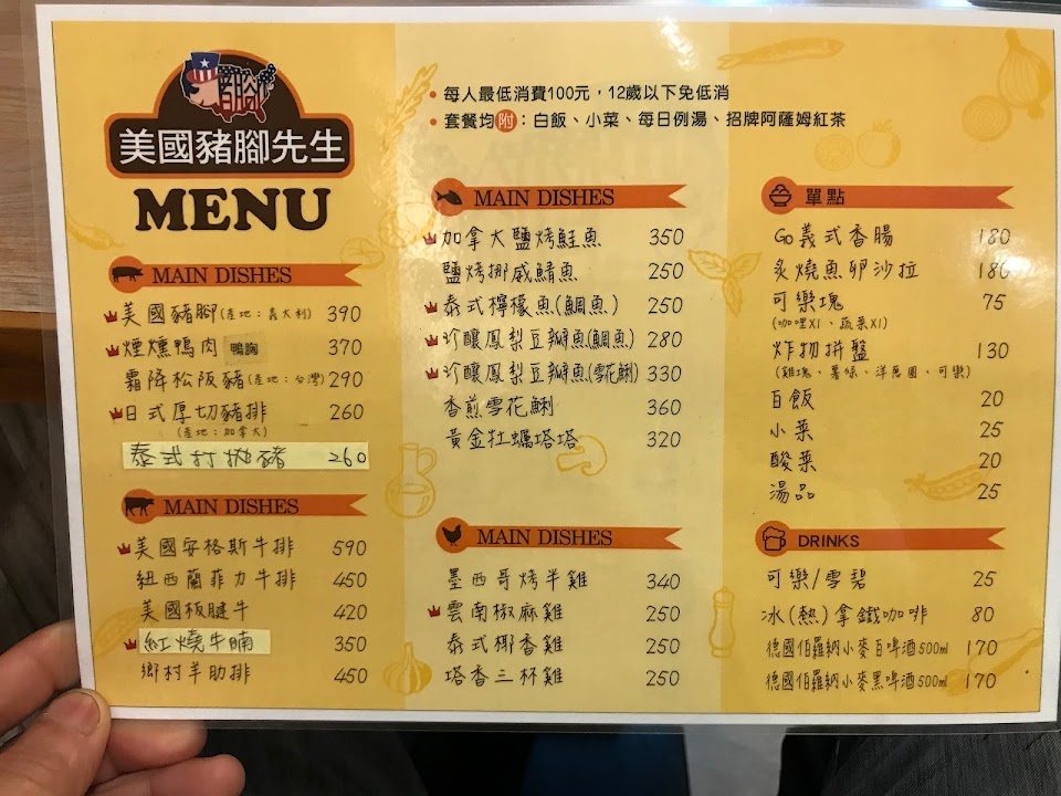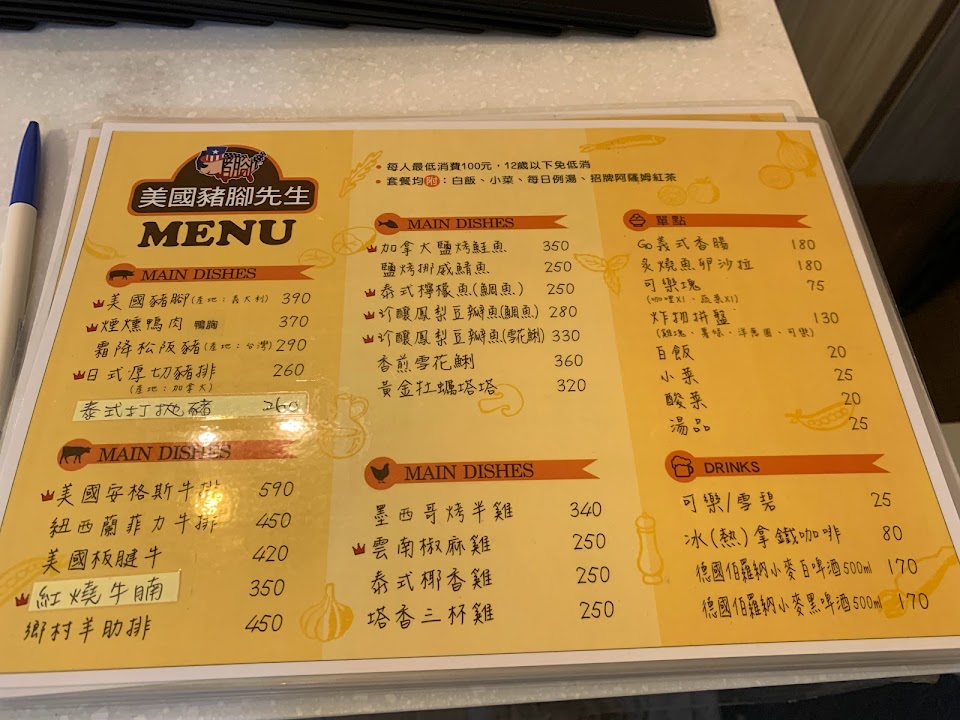 美國豬腳先生風味餐廳,位於苓雅區青年一路4巷1號(文化中心附近巷弄內),用餐環境乾淨舒適,餐點已套餐為主,當天消費「美國豬腳」和「煙燻鴨胸」,套餐方式呈現特別,有附三道菜、白飯和湯品,中西式融合餐廳,兩樣主餐不錯,並有提供兒童座椅,整體服務佳! 服務 內用 餐點類型 晚餐 平均每人消費金額 $200-400 餐點:4 服務:4 氣氛:4 親子友善程度 提供兒童安全座椅