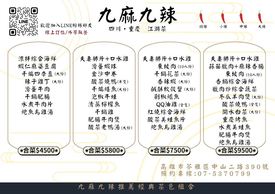 來吃過三次了,每次都會嘗試點沒吃過的菜,不曾踩過雷,算是我個人吃過的合菜餐廳中覺得最滿意的。價位也算合理,一個人消費均價650元。菜色多元豐富,很四川味,花椒香氣很棒。份量多,兩個人點三菜一湯每次都吃不完要打包。停車也算方便,附件有一付費停車場。小缺點是只有六桌很容易客滿,假日務必要先預約。此次的三菜一湯如圖總價1280。