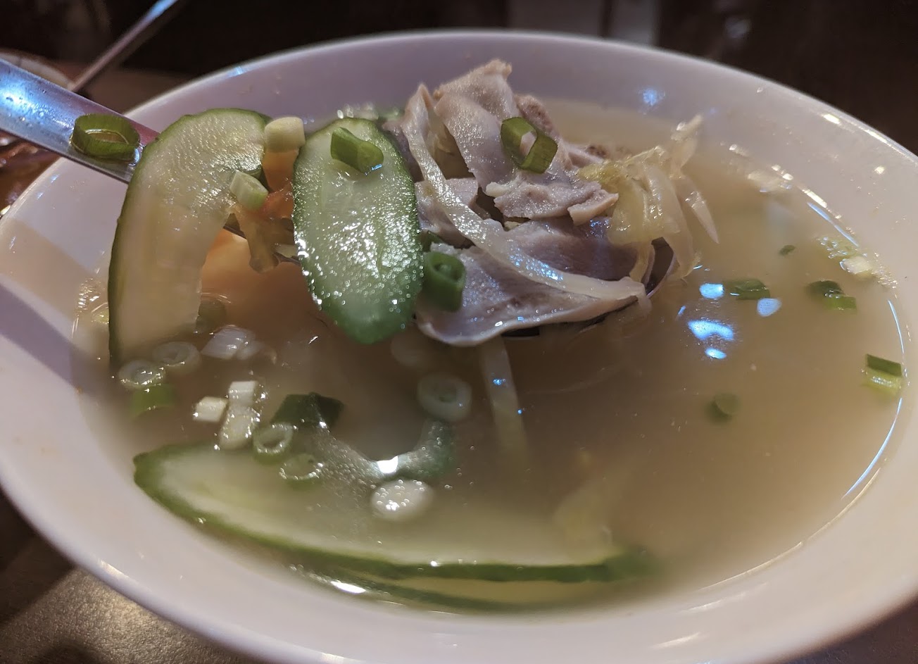 有辣度可以選擇,因為平時偶爾吃辣,所以點了微辣。每道菜的香氣都點綴地恰到好處,是香料煸出來的香氣,不會有使用辣油使得料理又辣又油的。肥腸脆爽,又帶有豬油香氣。酸豆土豆絲非常開胃,又有著泡椒帶出的辣。水煮牛的肉片軟硬度恰到好處,軟嫩又帶有口感,並且除了常見的黃豆芽外還有小黃瓜片,點綴少許清爽味道。