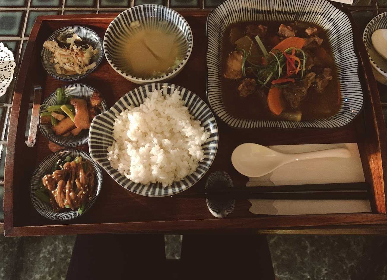 很復古的一間餐廳 連服務人員都穿的好復古太可愛了,餐廳放著美少女戰士的歌真的宛如在五零年代的日本(?!) 環境都可以讓你參觀,有兩層樓也有榻榻米座位區!還有包廂!三樓是酒吧,不過那時候剛好在整修所以就沒上去,真可惜。時鐘也很復古,還有電視魚缸,喜歡復古的人一定要來這裡,大推。 餐點為紅燒牛腩及塔香三杯雞,價格$310、$290我覺得稍貴,味道一般般。