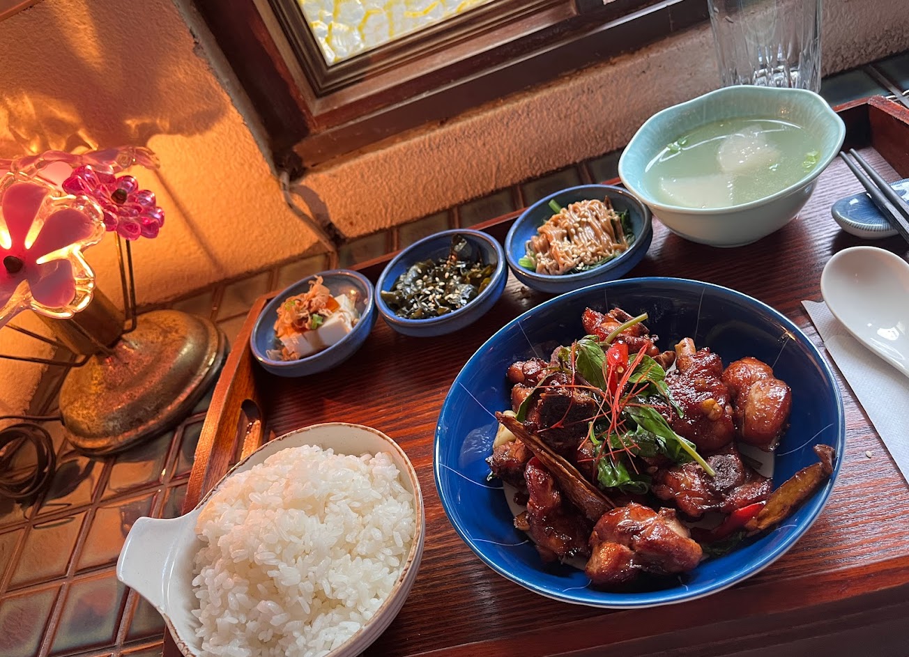甫踏入這家餐廳彷如被時光機帶我回到70-80年代的老餐廳,氣氛既懷舊又迷幻,我點的三杯雞套餐蠻好吃的,希望下次可以好好品嚐他們家的調酒!