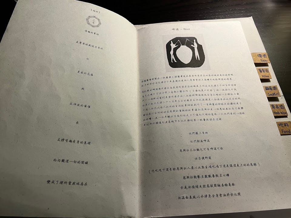 店面走中國古風的小酒館,氛圍安靜而和諧,酒單是用卷軸做成的,酒的名稱也是非常有中國古典的感覺,酒感算偏輕盈的,個人覺得很適合平常下班後來喝個一兩杯再回家休息