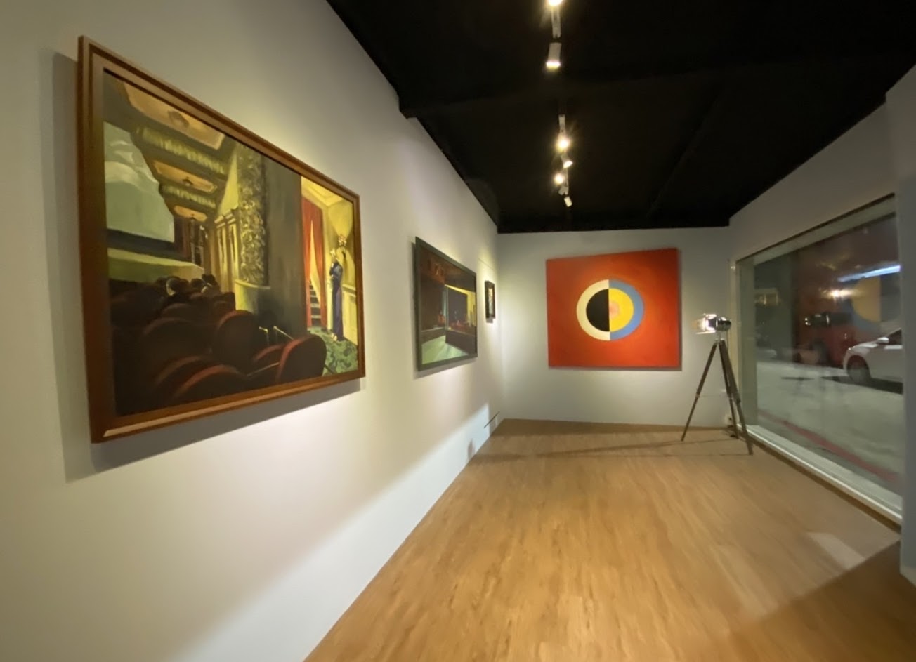 深夜的巷弄內三角窗看到一間明亮的畫廊