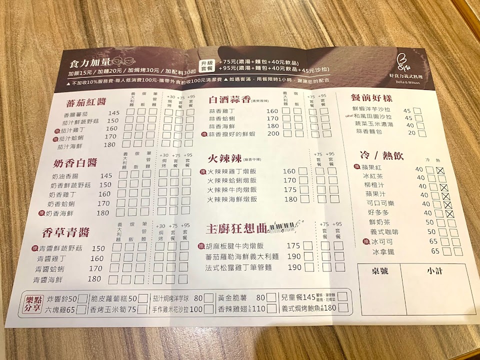 在桂林這邊的平價義式料理店家,紅醬/白醬/青醬/蒜香皆有,可以針對主要的配料進行義大利麵/筆管麵/燉飯的選擇,店家也有加價升級套餐的服務。
