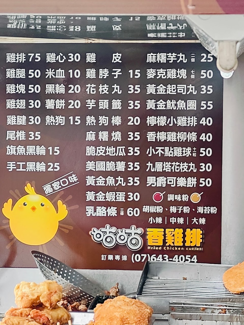咕咕雞算是林園一大特色了,每次朋友來都會帶他們來吃,特點是「胡椒撒到你懷疑人生」,胡椒鹽真的是撒很重,必點「雞排」、「米血」(內行人偷偷推薦打電話可以預訂不沾粉的雞腿,非常多汁但有點油),他們的雞排不像外面的很厚實一片,是薄到有點嚇人、口感也因此有些柴,但是也因此非常脆又很香,很多人愛吃(我自己也是)明明沒有多少肉,但是調味平衡的很好,吃起來就是很順口,讓你一口接一口停不下來!!人多到爆炸,建議預約點餐再來拿,是一間不知道怎麼說他好吃在哪裡,但是你就是會想吃的神秘店舖。