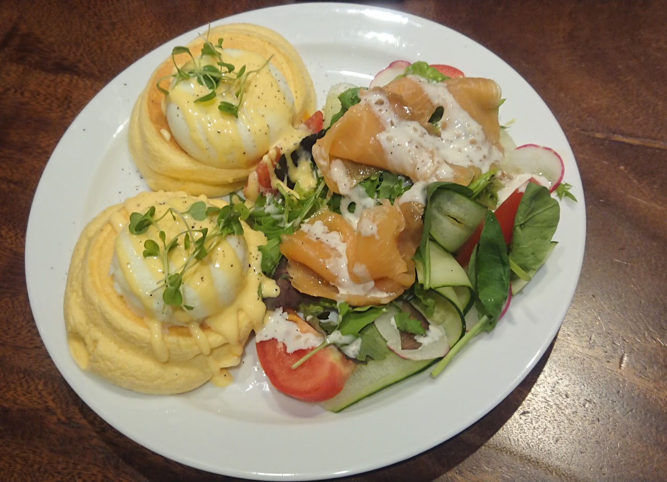 甜舒芙蕾鬆餅跟沙拉飯都好好吃,食材用料很好、也很新鮮,每一口都吃得出來。