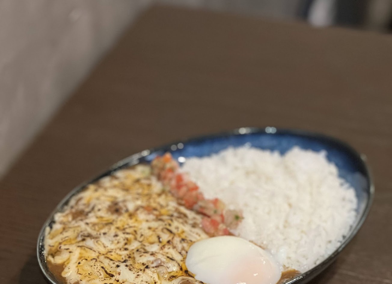 咖哩端上桌,中間用了一排番茄加小黃瓜切丁,猶如一道護城牆完美的分隔咖哩和白飯,白飯放上一顆溫泉蛋(須加購20元)。