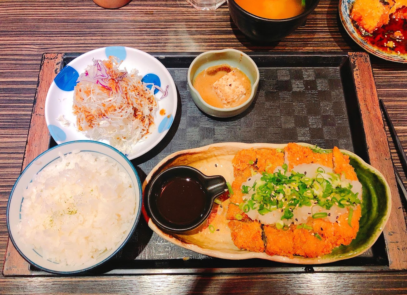 濃濃的日式佈置,採板前桌飲食,點了鮮蔥豬排定食,豬排比手掌略小,厚度約2公分,淋上獨門醬汁上頭再鋪上白蘿蔔泥,一口咬下爽口不膩,搭配豚汁湯、高麗菜絲以及嫩豆腐塊,整體而言有中上的水準。